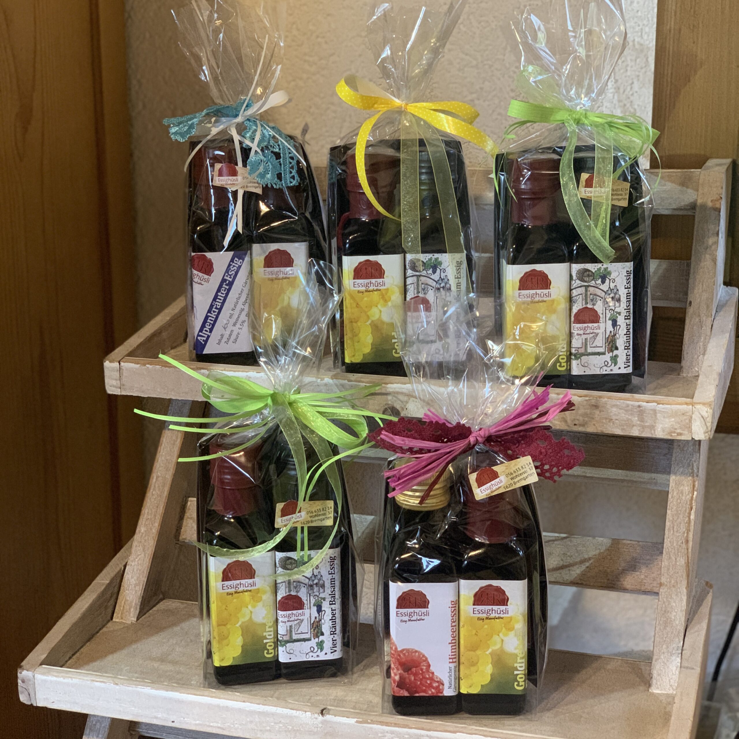 100ml Alpenkräuteressig, 100ml Goldrebenbalsamessig, 100ml Vierräuberbalsamessig. 100ml GigaFit-Vitalgetränk