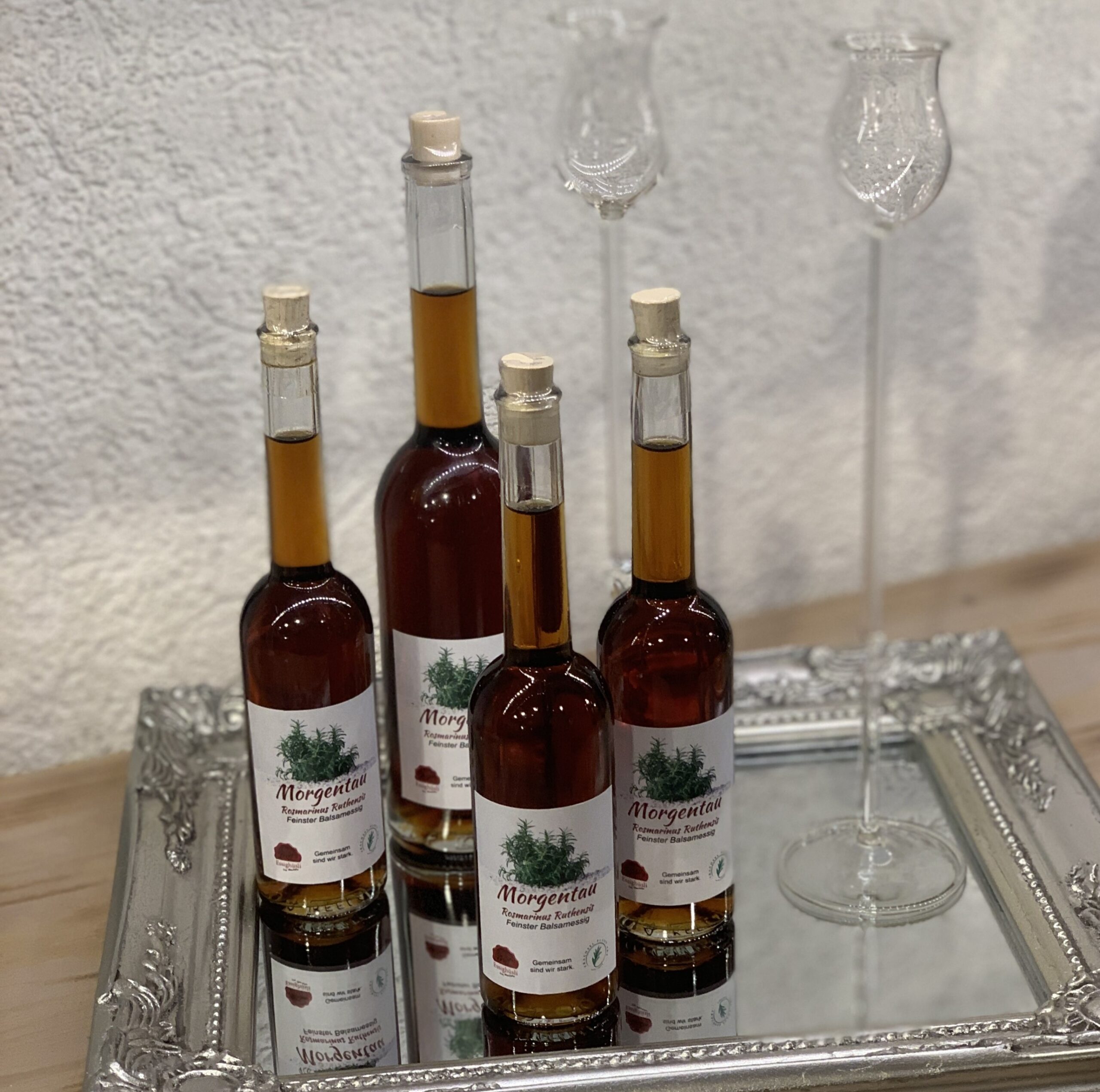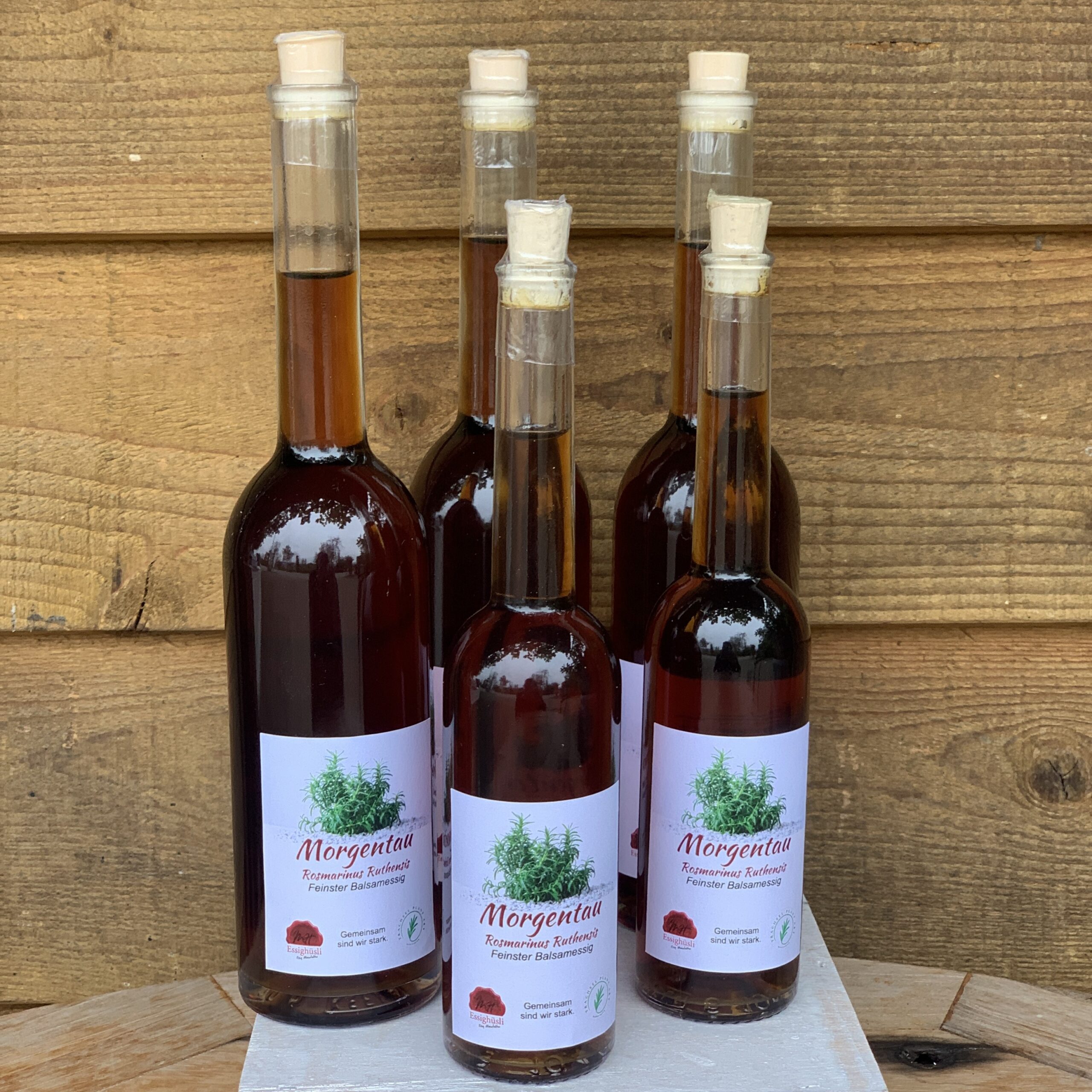 Entdecken Sie den einzigartigen Geschmack von Morgentau, einem handgefertigten Essig, der die Frische von dem eigens gezüchteten Rosmarinus Ruthensis mit der natürlichen Süße von Birnel vereint. Dieser exquisite Essig ist wie ein sanfter Morgenhauch, der Ihre Sinne belebt und kulinarische Kreationen veredelt.