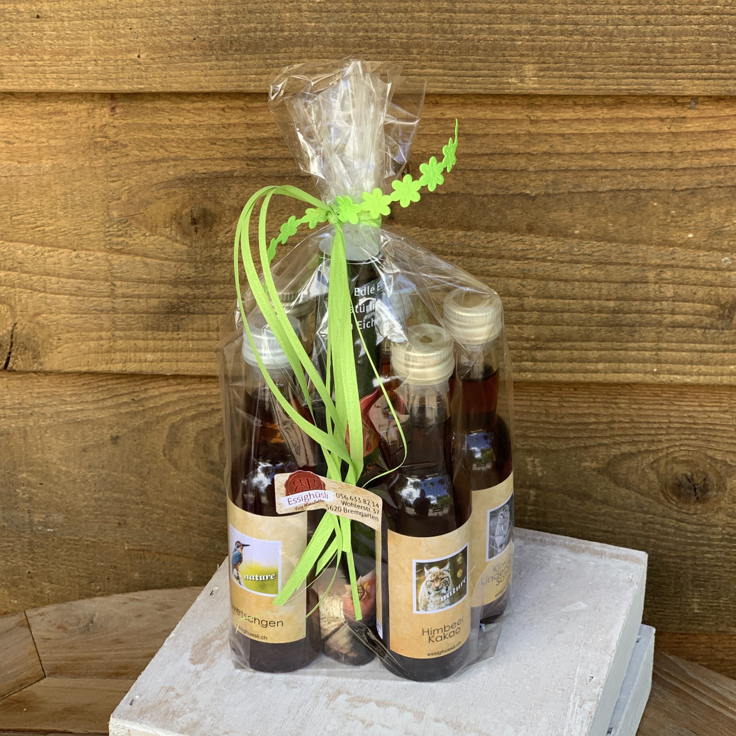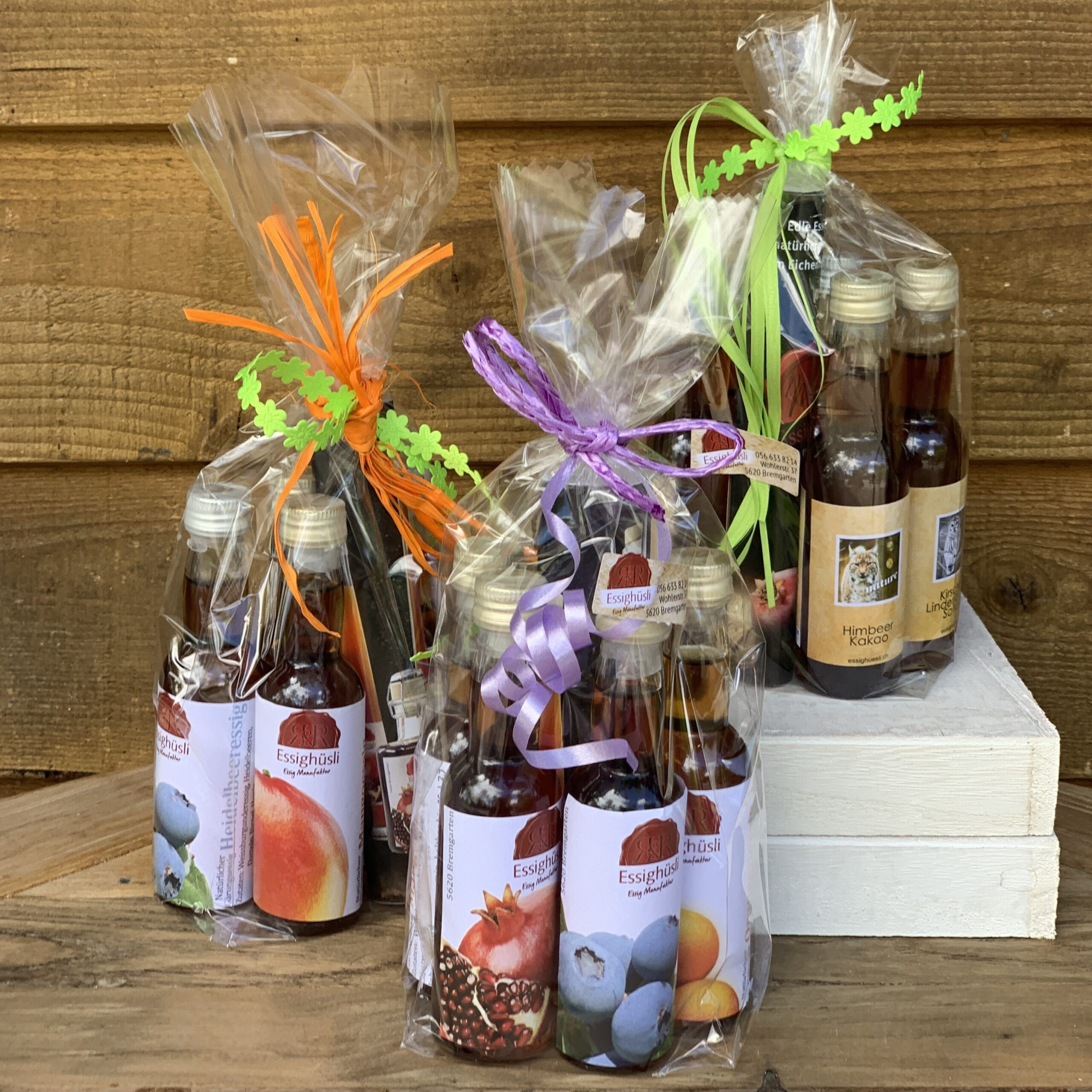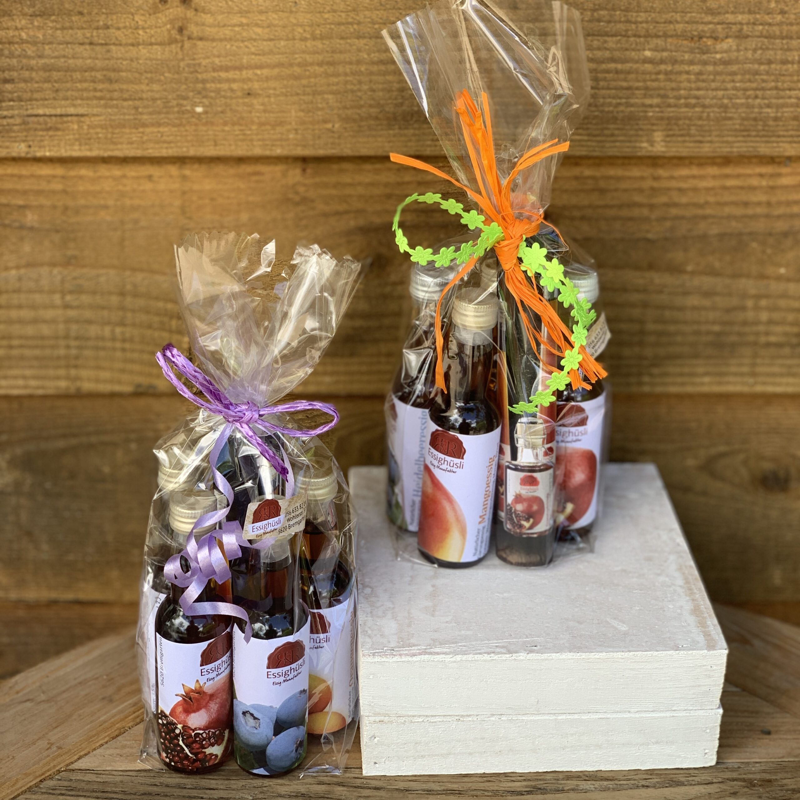 Zum Verschenken oder selbst Ausprobieren sind zwei Starter-Sets mit Mini-Fläschli unserer Essig-Spezialitäten in unserem Angebot.